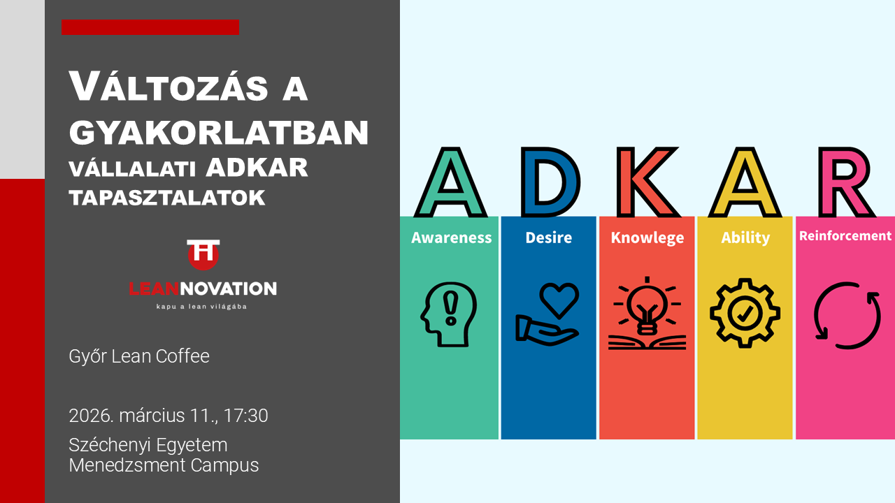 A mai gyorsan változó üzleti környezetben a szervezeti sikerek egyik kulcsa az egyéni alkalmazkodóképesség, a változások kezelése. A márciusi Győr Lean Coffee bemelegítő témája az ADKAR modell lesz, amely az emberi oldalról közelíti meg a változásvezetést.