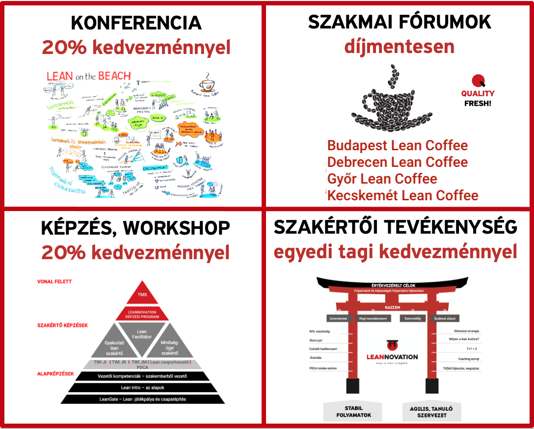 • Lean transzformációs projektek és egyéb fejlesztési együttműködés esetén további kedvezmények vállalati tagjaink részére.